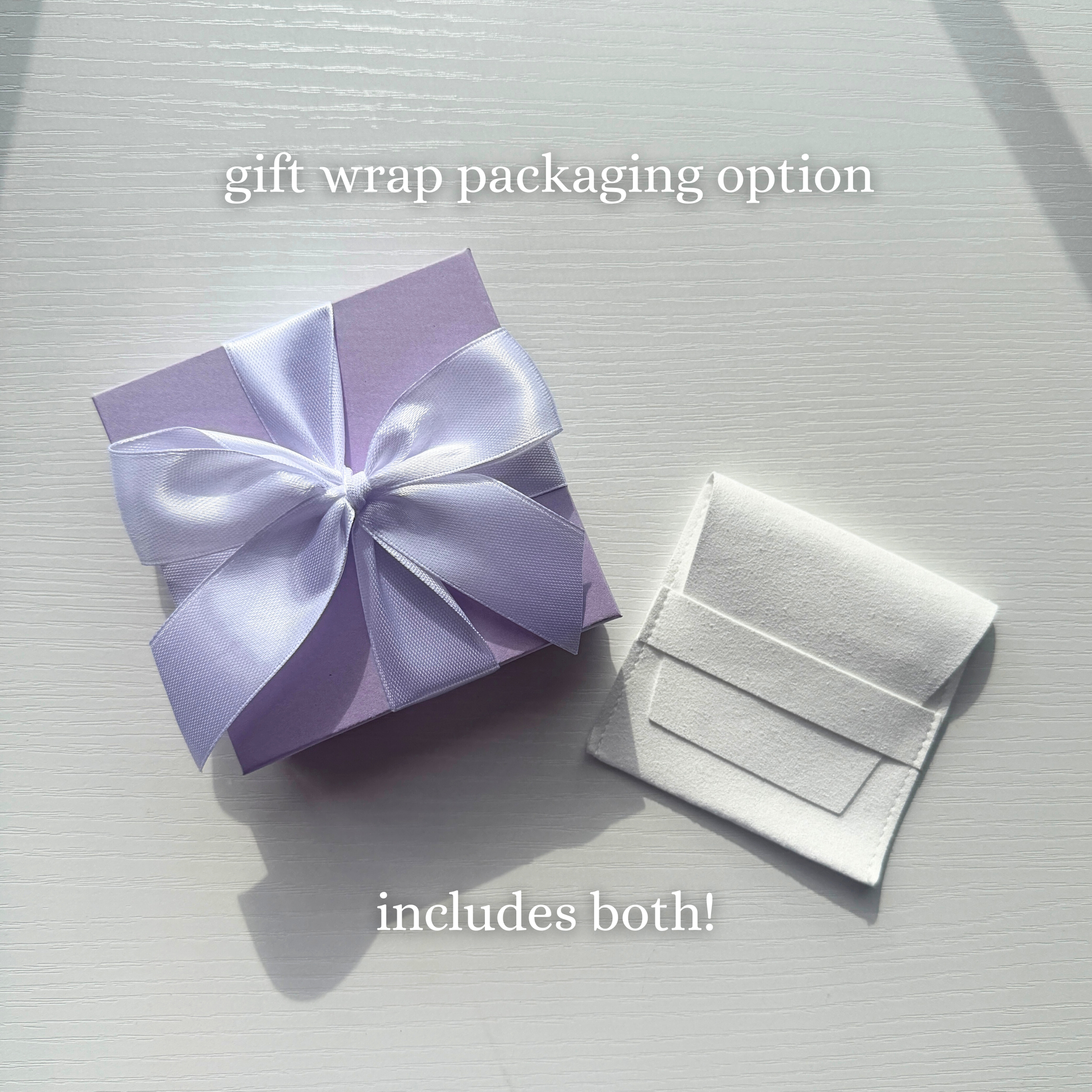 -gift wrap packaging is an option to have your item wrapped in a white velvet jewelry pouch, as well as a purple jewelry gift box tied in a bow with ribbon. Perfect for gift giving, or to treat yourself to a better unboxing experience <3